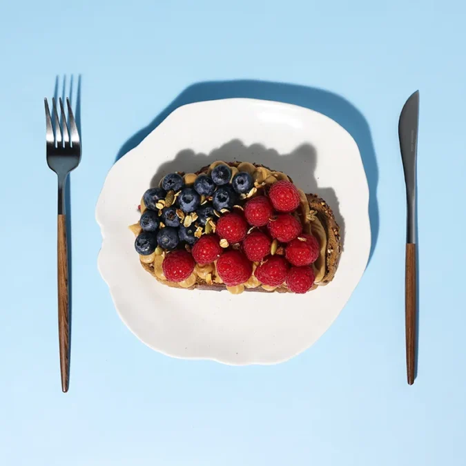 Toasted ciabatta topped with creamy mashed avocado, cherry tomatoes, and two poached eggs, garnished with red radish, pumpkin seeds, and a drizzle of olive oil. Total Calories: 297 kcal Protein: 12g Carbs: 24g Fat: 17g
