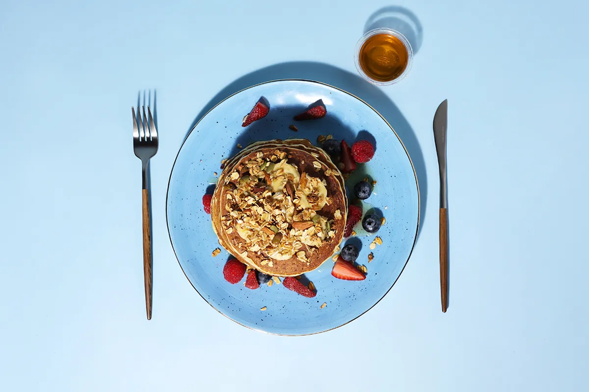Nutrient-packed pancakes made with vanilla whey protein, topped with fresh strawberries, banana, and a dollop of protein cream. Total calories: 455kcal Protein: 36.9g. Carbs: 56.3g Fat: 9.4g